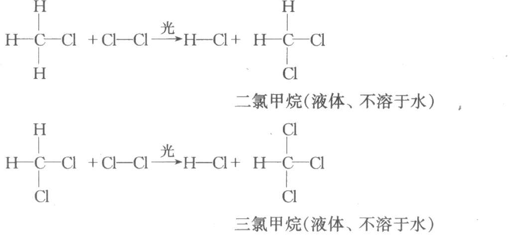 【多媒体动画展示取代反应过程】 讲述反应中生成的一氯甲烷可与氯气继续进一步反应,依次有生成了难溶于水的油状液体:二氯甲烷、三氯甲烷和四氯甲烷(四氯化碳)