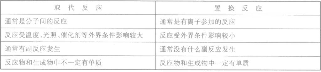 【学生书写二氯甲烷、三氯甲烷与氯气反应的方程式,教师利用希沃助手上传学生代表答案,集体点评。】 【讲解】有机化学的反应中往往发生副反应,所以在有机化学方程式中用箭号来代替等号 【讲述】甲烷与氯气发生了反应生成一氯甲烷、二氯甲烷、三氯甲烷、四氯甲烷和氯化氢。由于氯化氢极易溶于水,产物中只有一氯甲烷是气体,二氯甲烷、三氯甲烷、四氯甲烷都是不溶于水的液体,所以量筒内气体黄绿色褪去、有白雾,水位不断上升、内壁有油状物质生成。 【讲述】这种反应类型叫取代反应。 【板书】2.取代反应: 【强调】该反应的历程并归纳反应特点。在这些反应里,甲烷分子里的氢原子逐步被氯原子所代替而生成了四种取代产物。 有机物分子里的某些原子或原子团被其它原子或原子团所代替的反应叫做取代反应。 【介绍】四种取代产物的性质和用途 【提问】取代反应属于置换反应吗? 【讲述】有机化学中的取代反应与无机化学中的置换反应是不同的,下表是它们之间的一些区别: