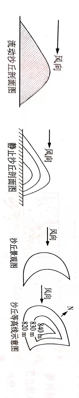三、风沙地貌 1、干旱地区风沙地貌发育的原因 (1)昼夜温差大,物理风化作用强,沙源足。(2)植被稀少,利于风沙活动。(3)多大风活动。 2、风沙侵蚀地貌:风蚀蘑菇、雅丹 3、风沙堆积地貌 (1)常见的风沙堆积地貌除了沙丘外,我国的黄土高原也属于风沙堆积地貌,据考证:黄土高原厚厚的黄土是偏北风从北部高原上吹过来的。 (2)沙丘坡面形态与风向的关系。 沙丘迎风坡平缓,背风坡较陡。沙丘坡面形态与风向的关系如下图所示: |