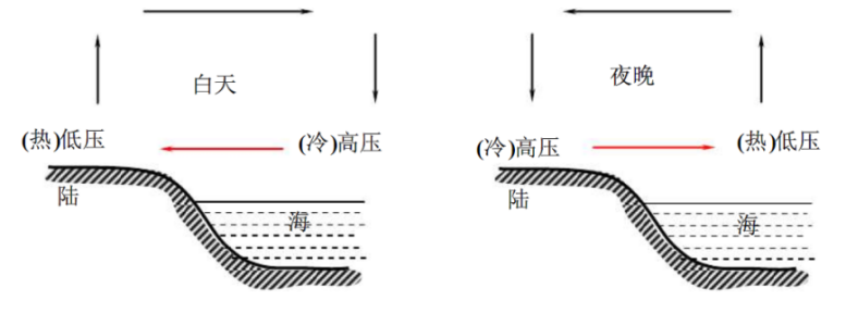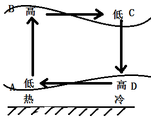 ★四地气压比较: D>A>B>C 注意:地理上讲的高压、低压,指的是同一高度的水平面上,两点气压比较,高值为高压,低值为低压。 2、常见热力环流形式★★★<1> 海陆风