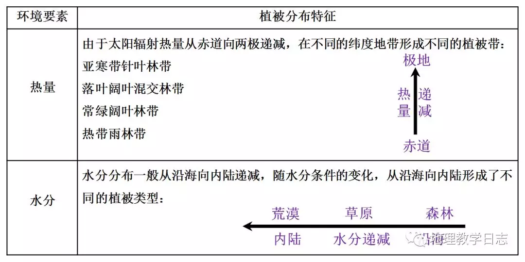 | 水分 | (1)从沿海向内陆形成了森林—草原—荒漠的分布状况(2)影响植物形态 |