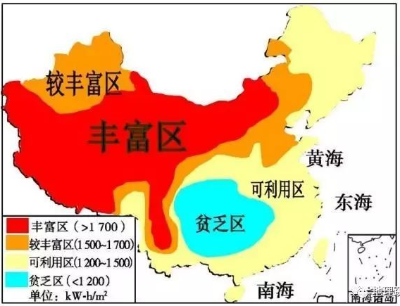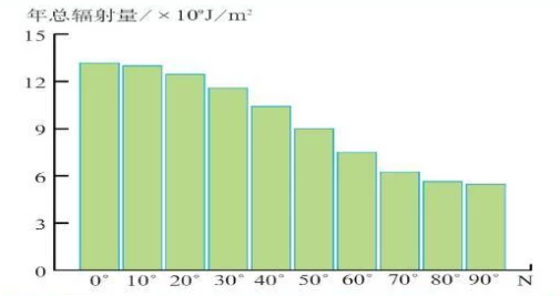 ③30°N~40°N地区,随纬度的增高,太阳辐射能也增加;而40°N以北地区,太阳辐射能由东向西逐渐增加。